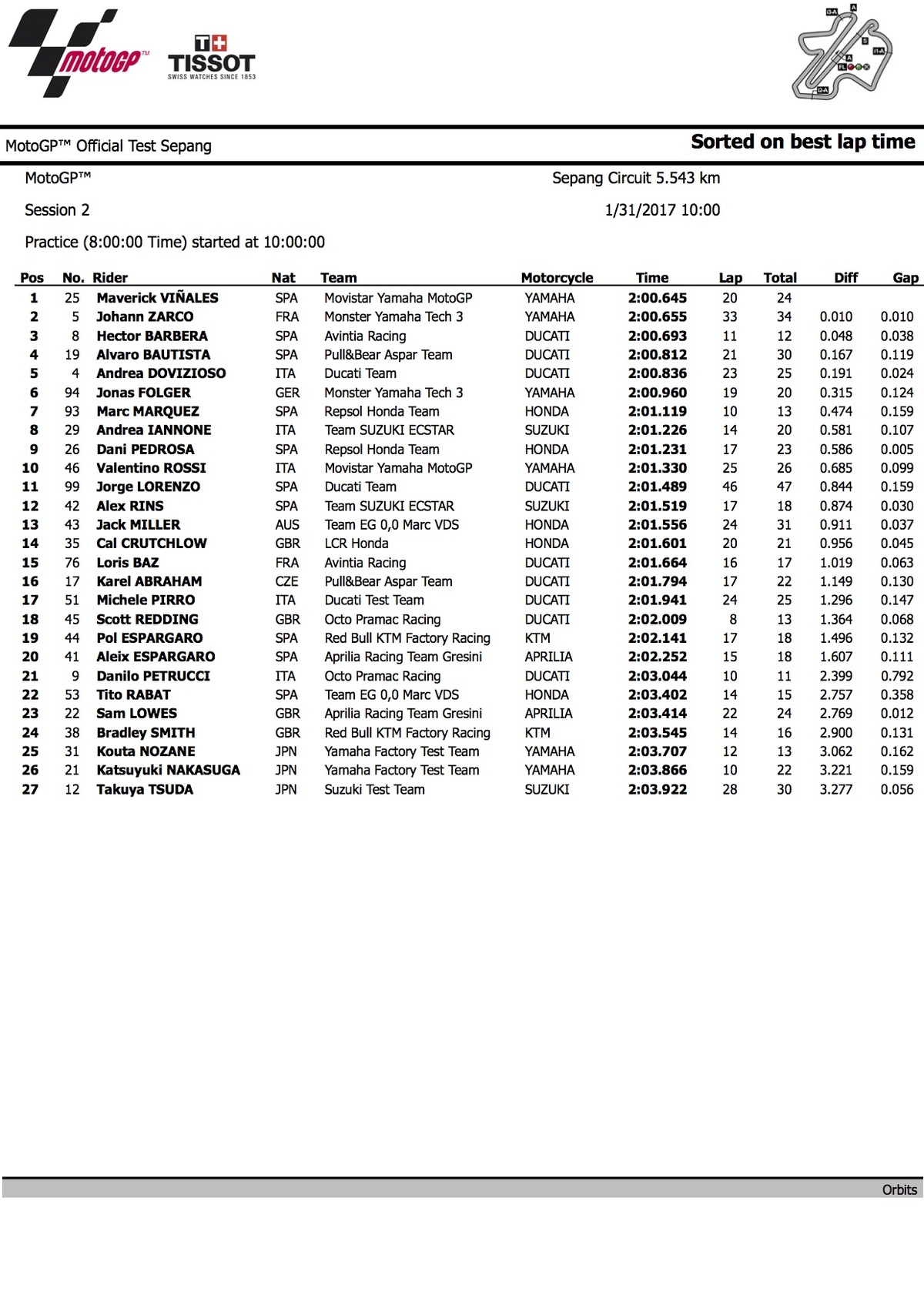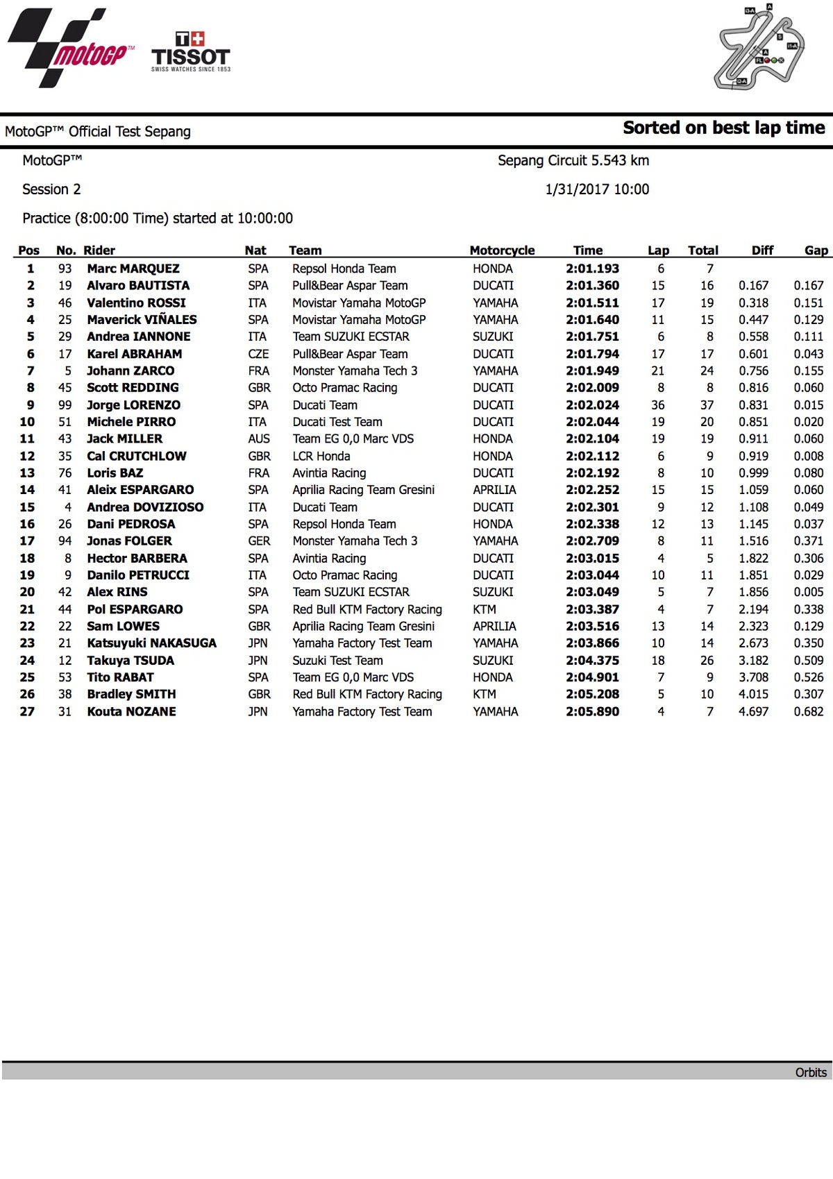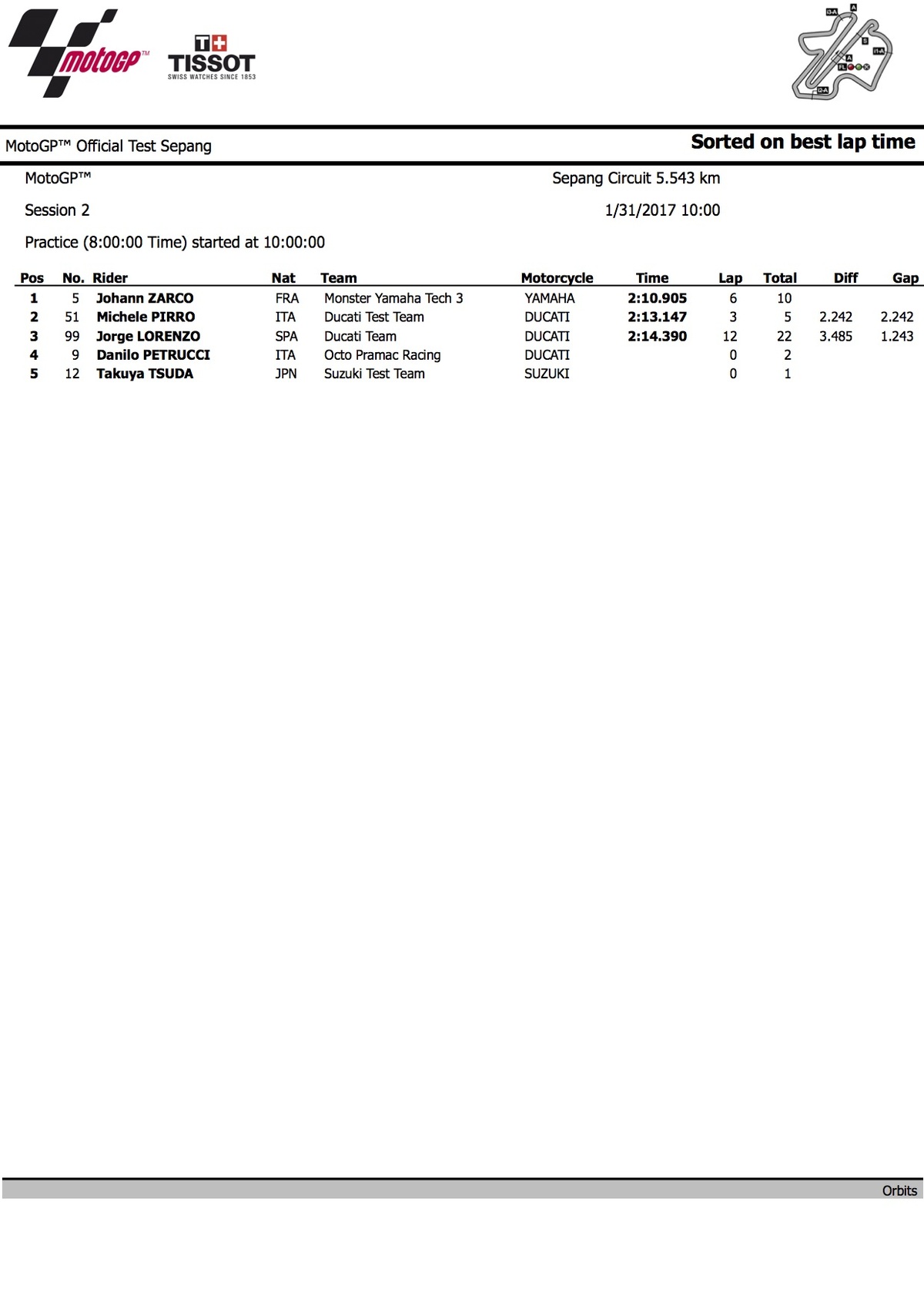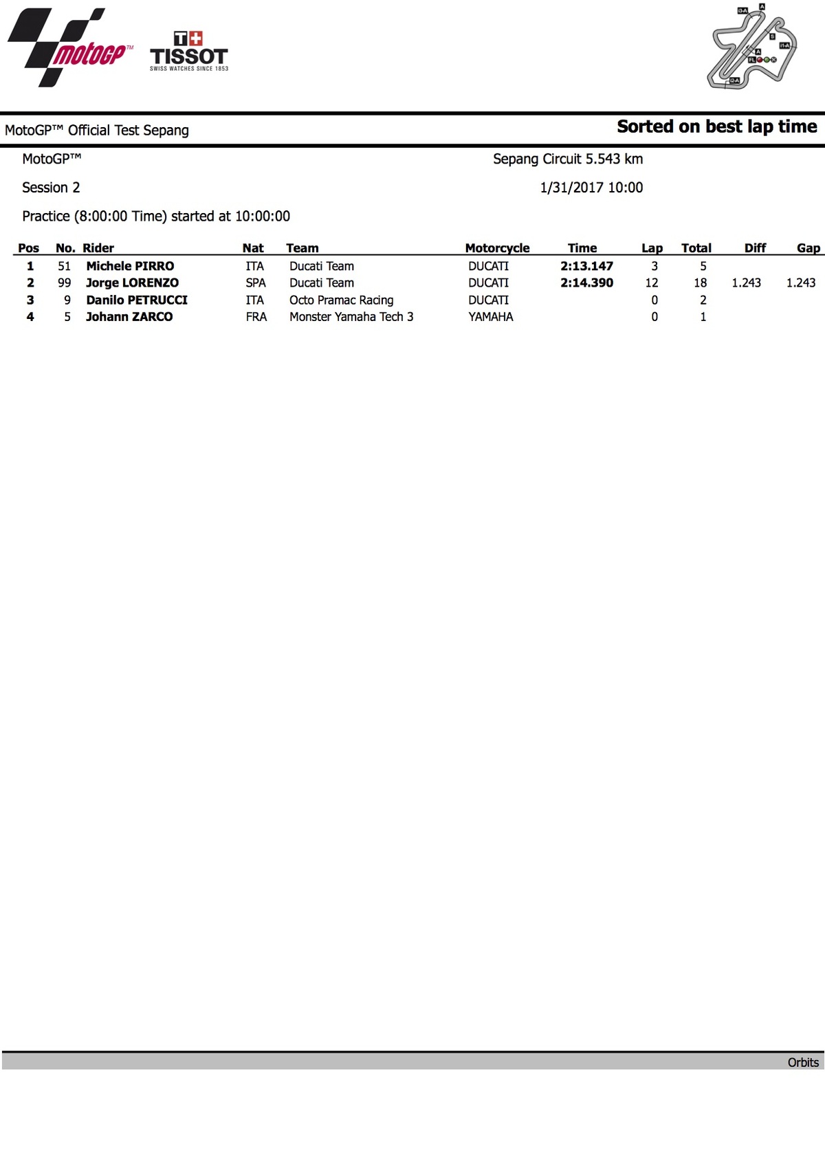 | 19 | PIRRO, Michele | Ducati Test Team | 2:01.382 | 1.930 | 0.155 | 37 / 45 | |