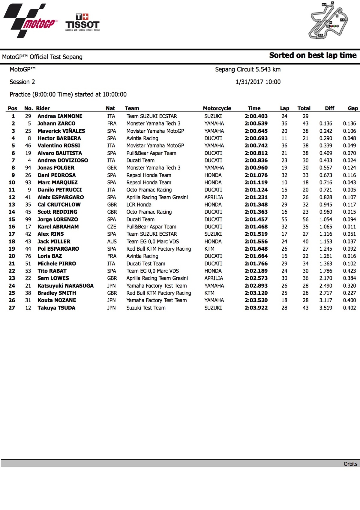 SEPANG – Andrea Iannone chiude la seconda giornata di test con il miglior tempo, davanti a Maverick Viñales e a un consistente Alvaro Bautisa. Quarto Valentino Rossi, settimo Andrea Dovizioso, ottavo Jorge Lorenzo (decisamente più veloce di ieri), solo decimo Marc Márquez. Caduta di Tito Rabat alla curva 7, il pilota Estrella Galicia 0,0 Marc VDS dovrà essere operato nei prossimi giorni.