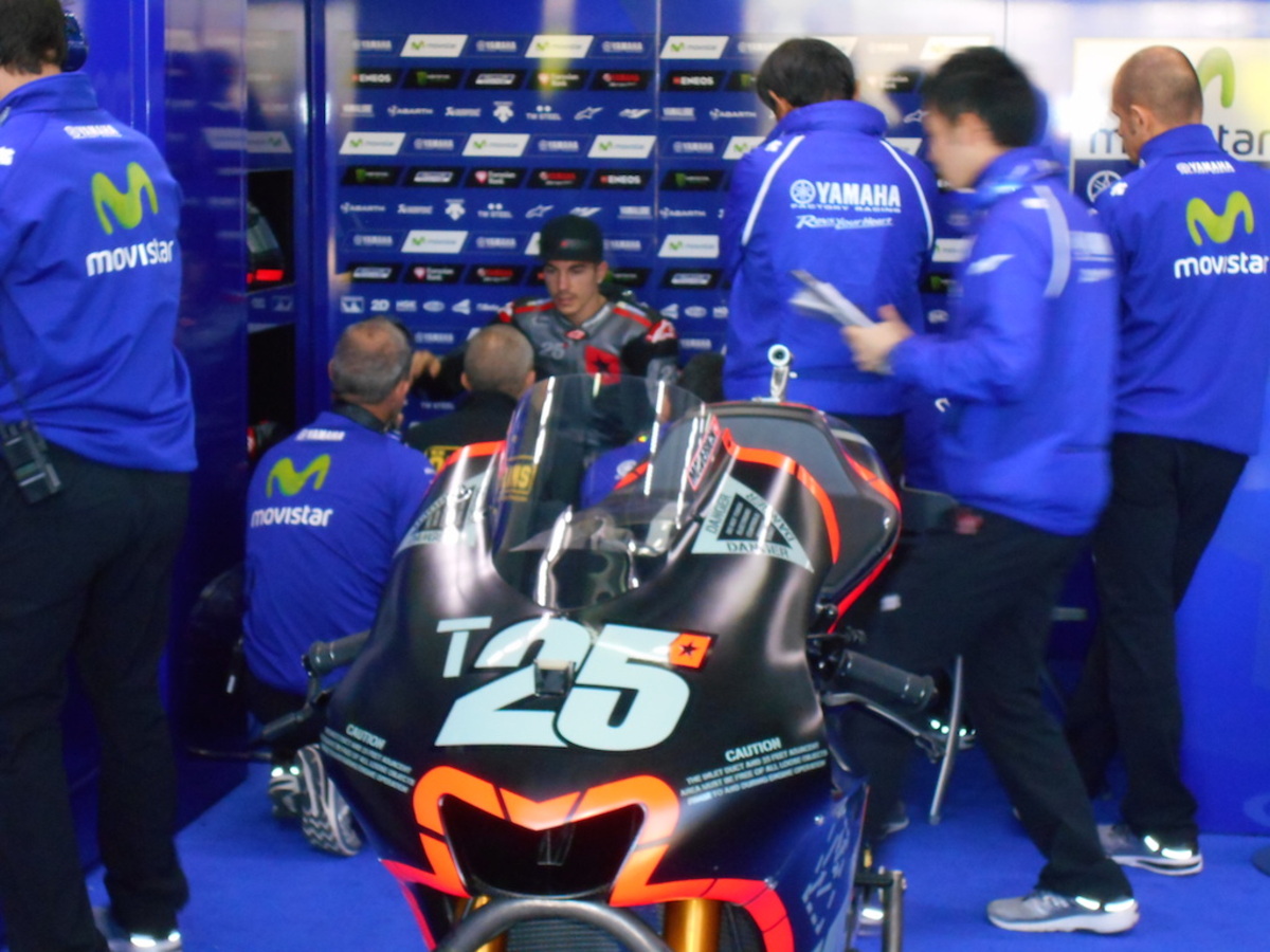 al box sono già pronti maverick vinales con la nuova yamaha m1, pecco bagnaia, che avevdo vinto due gp quest’anno, ha ricevuto come premio dal team di poter provare la “ducatona” GP14.2