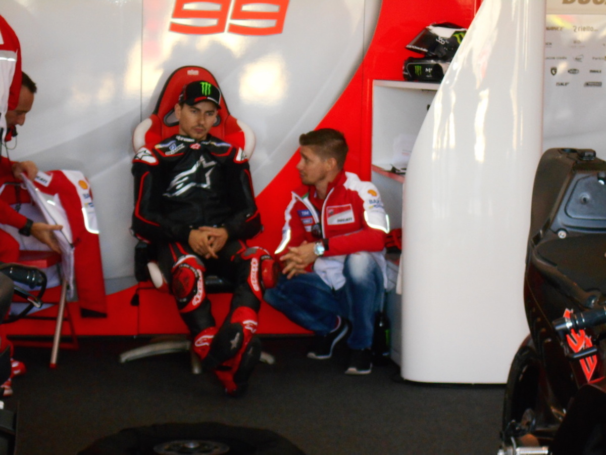 lorenzo, molto sorridente, parla nel box ducati con casey stoner