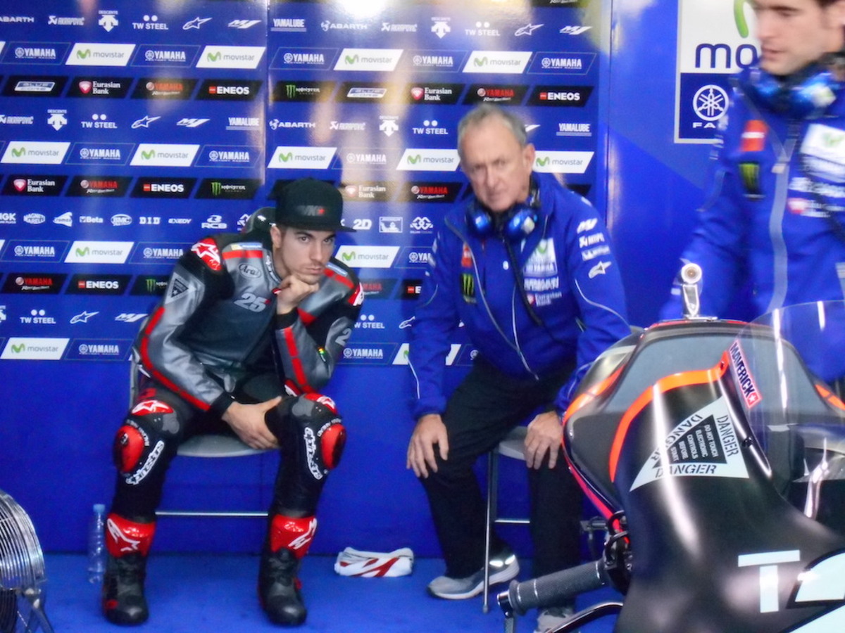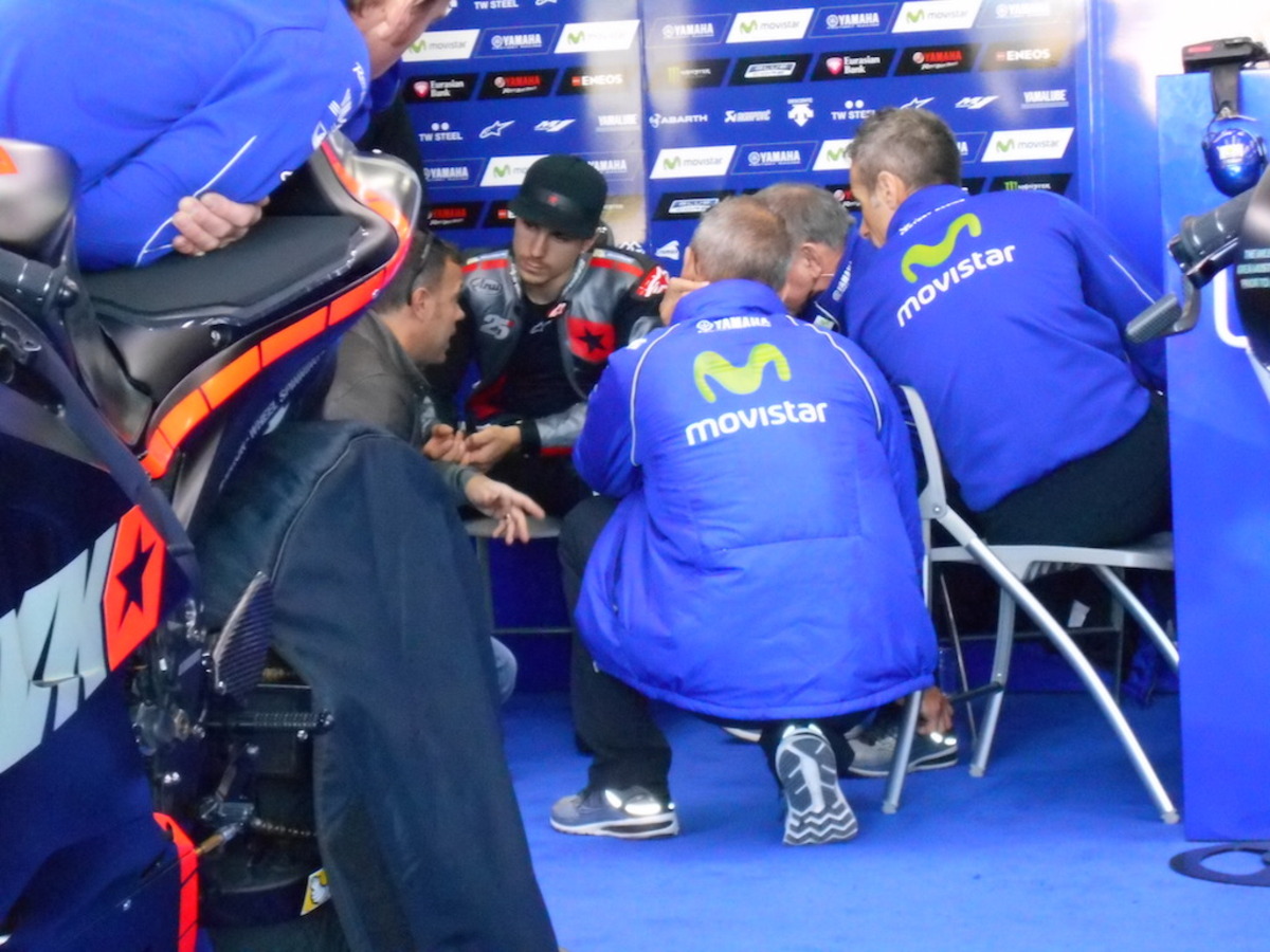 vinales rientra ai box e parla con il suo nuovo capo tecnico, l’esperto e bravo ramon forcada. pedrosa in pista
