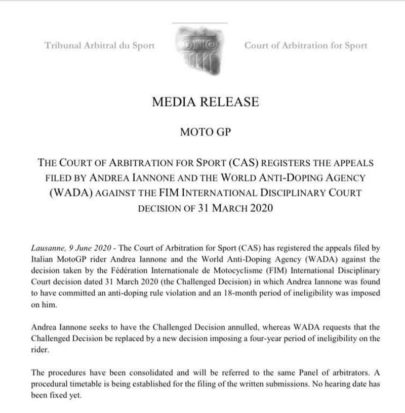 La corte arbitrale sportiva (CAS) ha registrato gli appelli presentati dal pilota italiano della MotoGP Andrea Iannone e della World Anti-Doping Agency (WADA) contro la decisione presa dalla Corte Disciplinare Internazionale della Federazione Internazionale Motociclistica (FIM) in data 31 marzo 2020 in cui Andrea Iannone è stato riconosciuto colpevole di violazione della normativa antidoping, con l'imposizione di un periodo di sospensione di 18 mesi.