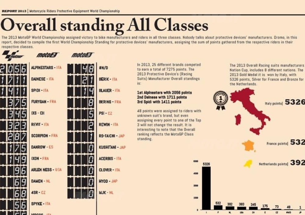 Quello che invece a noi interessa, come curiosità, è la serie di dati pubblici che sono emersi da questo studio. La distribuzione per nazioni dei produttori di tute, chi ha vinto - assegnando gli stessi punti del campionato piloti - nelle diverse classi e chi protegge più piloti in ciascuna categoria. Insomma, un Campionato del Mondo costruttori, dove al posto delle Case motociclistiche troviamo i produttori di tute di pelle.