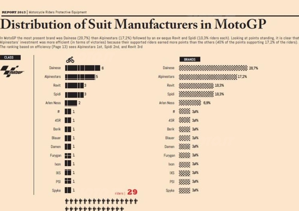Come prevedibile, noi italiani facciamo la parte del leone. I 124 piloti delle tre categorie della MotoGP vengono protetti da 25 diversi costruttori: di questi i primi quattro per presenza (Dainese, Alpinestars, Spidi ed IXS) sono italiani e coprono il 53% dei piloti. Dainese supporta il 18% dei piloti impegnati nel Mondiale, staccando di poco Alpinestars (15%); Spidi si occupa di un altro 11% contro il 9% di IXS.