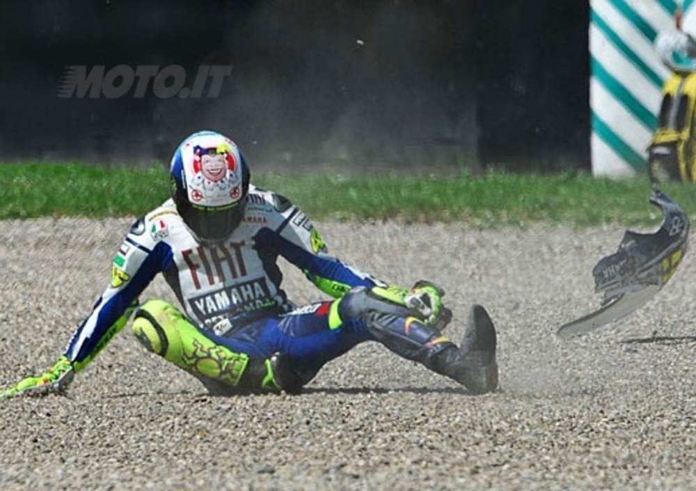 All’ingresso della Biondetti1, una “sinistra-destra” da 180 km/h, la gomma posteriore ha perso aderenza e Valentino Rossi è stato sbalzato di sella