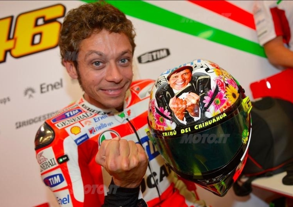 Forse non ci si riuscirà in tempo per il "Festival del Mugello", che Rossi assieme al solito Aldo Drudi si è inventato per l'occasione, ma lo spirito è quello giusto. Sulla parte anteriore, appunto, spicca Morandi nel suo tipico gesto d'incitamento a pugni chiusi; sul retro, il 46 con il piccolo "58" di Simoncelli al suo interno, i due cani di Valentino e il verso "Fatti mandare dalla mamma a prendere il latte". Messaggio quantomeno criptico, che magari Rossi spiegherà in diretta TV.