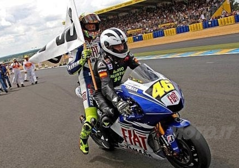 Dopo la Cina, è la volta della Francia: il campione di Pesaro vola a quota 90 gran premi vinti, un traguardo raggiunto in passato dal campione spagnolo Angel Nieto (che ha portato Rossi in trionfo nel giro d'onore).