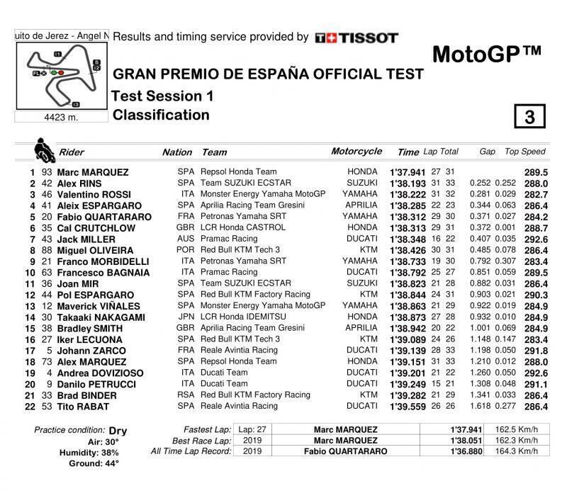 Stando ovviamente ben attenti a non farsi prendere la mano da questo primo responso, si può dire che Marc Márquez e la Honda hanno ritrovato la migliore condizione, dopo le difficoltà dei test in Qatar. Marc è stato quasi sempre nelle primissime posizioni, per poi conquistare il miglior tempo nel finale, dopo aver totalizzato 31 giri, tutti di alto livello. Rimanendo in Casa Honda, non è andato male neppure Cal Crutchlow, sesto a 0”372 (per lui, però, un solo giro veloce), mentre fatica un bel po’ Alex Márquez, 18°a 1”210.