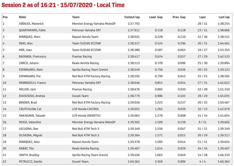 Sesto Pecco Bagnaia, 10° Franco Morbidelli, 12° Andrea Dovizioso, 16° Valentino Rossi (quinto nella combinata dei tempi), 22° e ultimo Danilo Petrucci, dopo essere finito al centro medico per un trauma cranico: il pilota è considerato fit, ma non ha concluso la sessione.