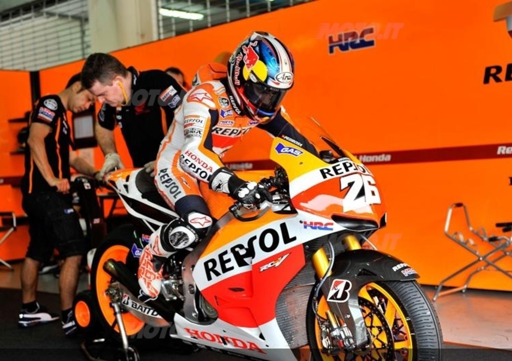 Non lontano c’è Marc Marquez, scivolato al mattino, senza conseguenze, quando ancora si girava con le gomme da bagnato, mentre Valentino Rossi è in difficoltà, esattamente come lo era ieri. Al momento, Valentino è solo settimo, dietro anche a Bautista, Bradl e Crutchlow, staccato di 0”750 dal miglior tempo di Pedrosa e con un vantaggio di appena 0”450 sulla prima Ducati, oggi quella di Nicky Hayden, a 1”204 dalla pole virtuale. Per il compagno di squadra Andrea Dovizioso tante prove, anche con la Desmosedici “laboratorio” quella utilizzata da Michele Pirro, con modifiche al telaio (in particolare nella zona di raccordo sella-serbatoio) e al motore.
