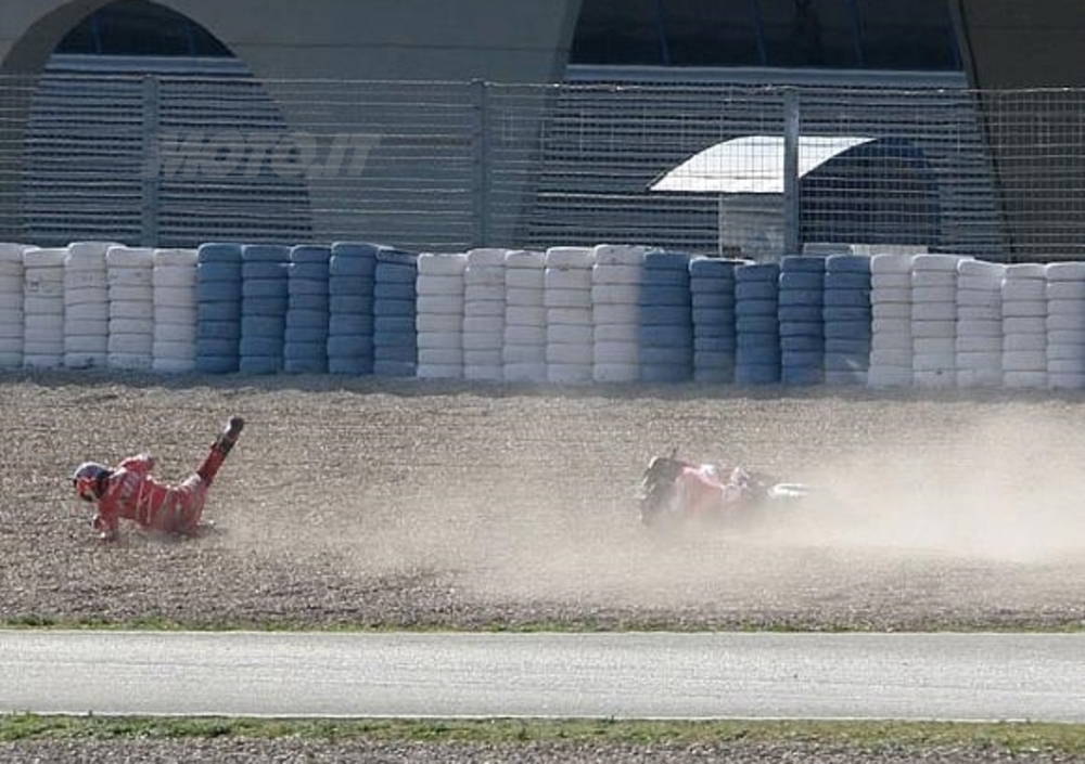Test pre-mondiale di Jerez. Casey Stoner cade e si infortuna al legamento della spalla. Pedrosa e Rossi i più veloci