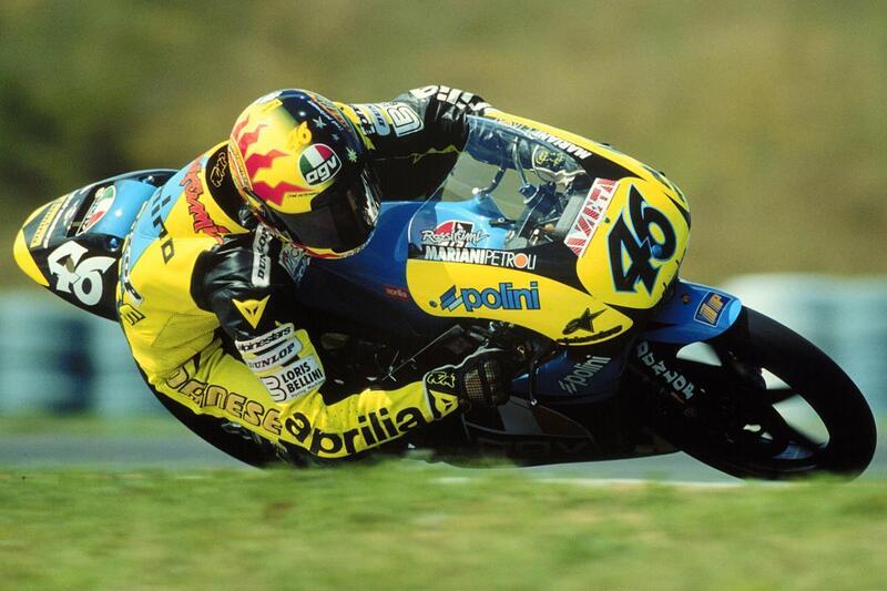 Se c’è l’ultimo dev’esserci per forza di cose anche il primo. Quello che poi, seppur modificato nel corso del tempo, ha fornito lo spunto a tutti quelli realizzati subito dopo: il sole da una parte, la luna dall’altra, il giallo, il blu e la voglia di trasmettere il carattere istrionico e scanzonato di un ragazzino che in quel 1996 si affacciava al motomondiale e che avrebbe scritto la storia delle corse in moto per il quarto di secolo successivo.