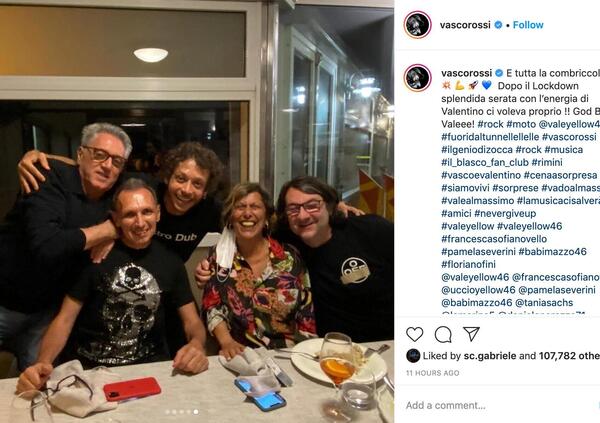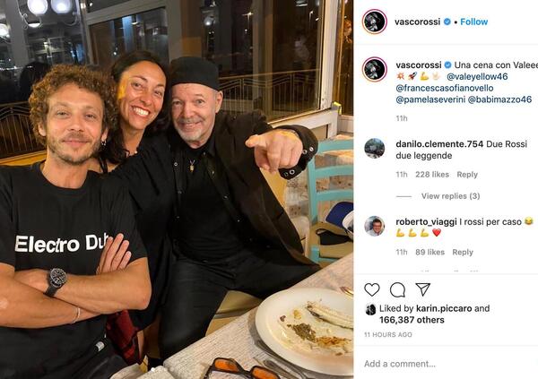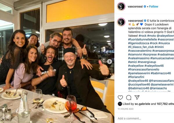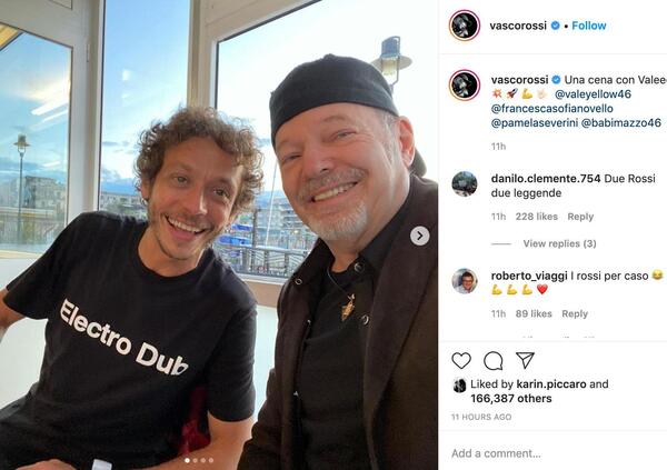 Da quando Vasco era già leggenda e Valentino cominciava a diventarci. Menù di pesce, ma nel segno della leggerezza. “Com’era la sogliola?” – ha chiesto Vale a Vasco commentando una storia su Instagram e ironizzando sull’avergli “rubato” gli occhiali. "Dopo il Lockdown splendida serata con l’energia di Valentino ci voleva proprio !! God Bless Valeee!" – ha replicato il rocker di Zocca nei suoi profili social, condividendo le foto della serata. “Senza parole”, e quindi il titolo della nota canzone di Vasco, è stato il commento di Francesca Sofia Novello, con quest’ultima che ha pubblicato diverse foto della serata anche sui post di Instagram: “Che spettacolo i due VR più famosi del mondo”.