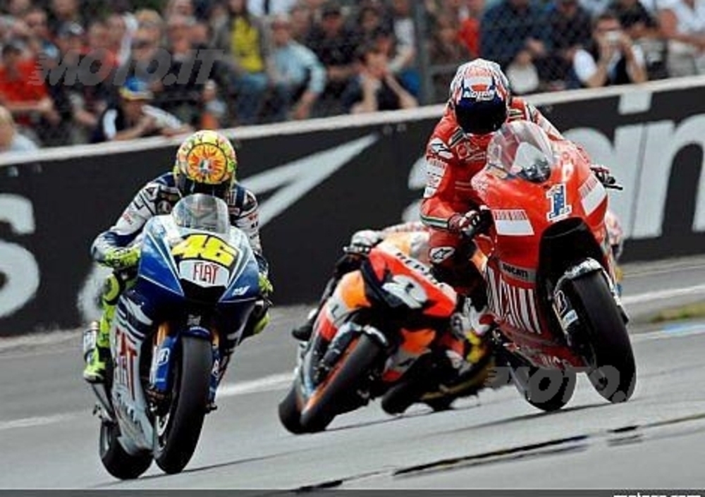 Stoner scatta dalla prima posizione e in soli 2 giri arriva ad accumulare un vantaggio di 3 secondi su Rossi. Valentino è attardato nel corso del primo giro da Dani Pedrosa e da una paurosa imbarcata che regala a Casey metri preziosi.