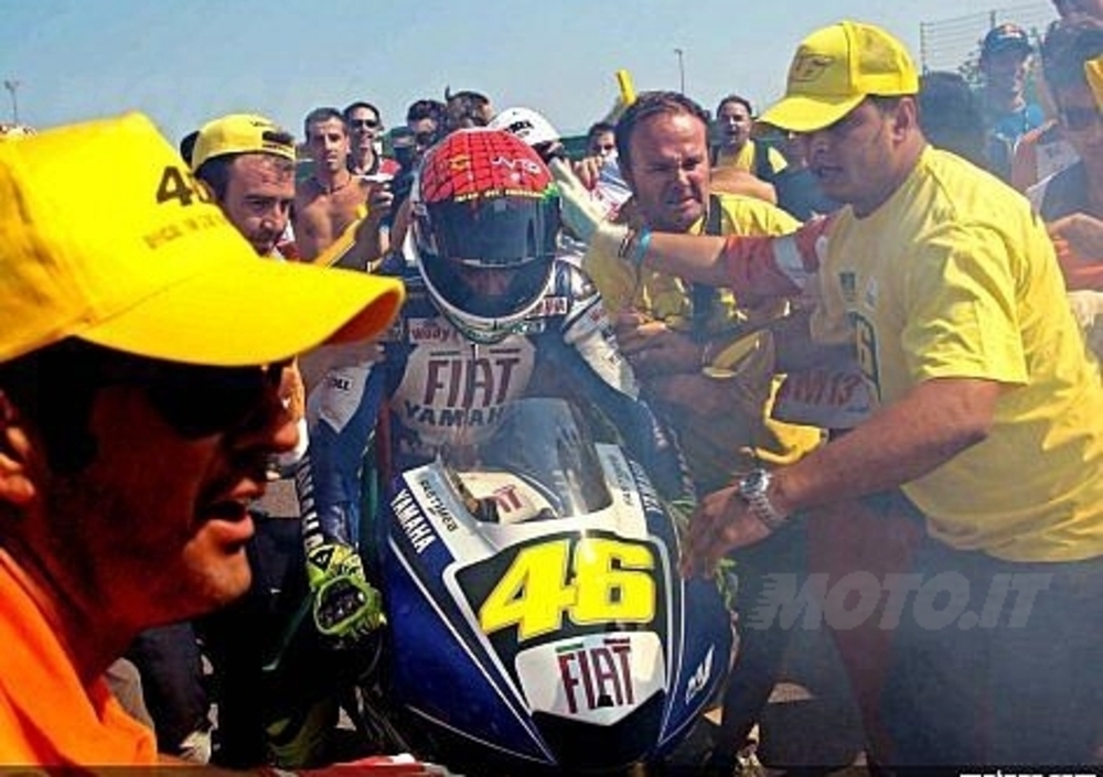 Manda per due volte fuori pista Marco Simoncelli che, finché i nervi tengono, risponde con fair play e lascia correre.