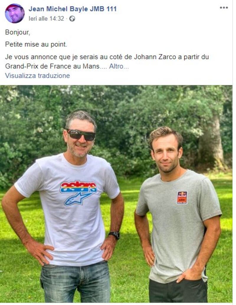 Johann Zarco si presenterà giovedì a Le Mans con un nuovo coach personale: è il mitico Jean Michel Bayle, il fuoriclasse francese, oggi cinquantenne, iridato nel motocross e nel supercross AMA, nonché pilota della velocità in 250 e 500 negli anni Novanta, e oggi uomo immagine di Honda. Jean Michel ha voluto precisare al proposito che il suo accordo è diretto con Zarco, e non con KTM.