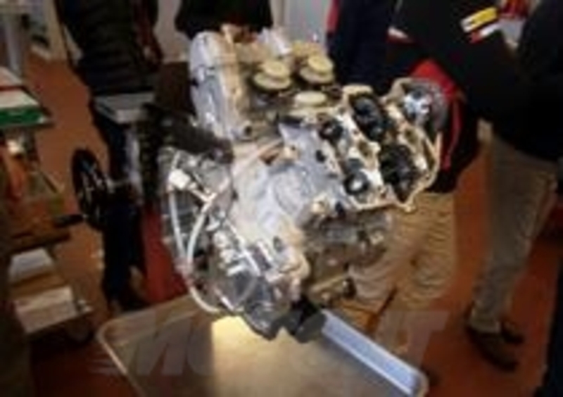 Entriamo nell’officina dove si preparano i serbatoi e a seguire in quella dove si producono le piastre di sterzo, per poi arrivare ad uno dei reparti più importanti dove sono posizionati ben otto banchi prova motore. Ammiriamo, dall’altra parte del vetro, un banco dinamico in funzione, sul quale un motore sta girando da alcune ore, sotto l’attento controllo di due tecnici. Il banco prova è ovviamente una parte determinante nello studio e nella preparazione dei motori, sia da corsa che di produzione. Per quanto riguarda quelli dedicati alle competizioni, si prende solitamente come riferimento la pista di Monza e si simulano dai 15 ai 20 giri per volta. Dopo di che si scaricano i dati, si valutano i trascinamenti, gli attriti ed i consumi e successivamente si può intervenire sui vari organi del motore che si intendono analizzare. Nel banco prova che vediamo al lavoro, l’aria può essere forzata negli air box simulando una velocità massima limite di circa 320 Km/h. Giocando sulla pressione dell’aria si può incrementare o diminuire la potenza del motore. Il tutto utilizzando ovviamente le centraline provenienti dal reparto elettronico. Tutti le varie fasi sono infatti collegate ed i diversi reparti lavorano a stretto contatto tra di loro, scambiandosi una grande mole di dati.
