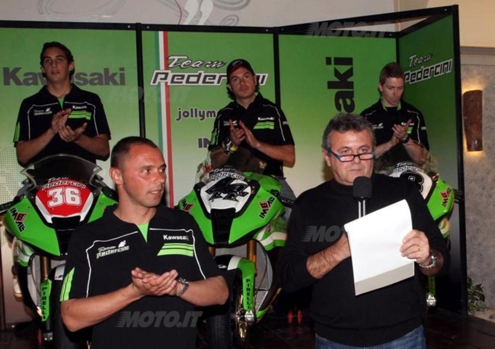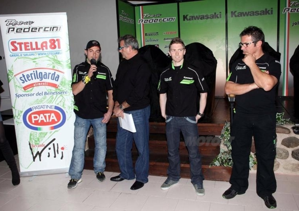 La presentazione del Team Pedercini 2011 si è tenuta il 2 Aprile presso il club “L’altro io” a Monzambano, in Italia, nei pressi del bellissimo Lago di Garda. Una bella serata alla quale ha preso parte un pubblico numeroso, più di cento appartenenti al “Lucio Pedercini Fan Club”. L’attenzione della serata si è focalizzata inizialmente su di una breve storia della squadra alla quale hanno fatto seguito delle brevi interviste a Donato, Donatella e Lucio Pedercini. Padre e figlio hanno spiegato le ragioni della scelta di partecipare sia al campionato mondiale Superbike che alla Superstock 1000 FIM, con ben cinque piloti. Durante la serata i due piloti Superbike Mark Aitchison e Roberto Rolfo hanno tolto il velo alle loro Kawasaki Ninja ZX-10R le stesse che porteranno in pista in tutto il mondiale Superbike 2011.