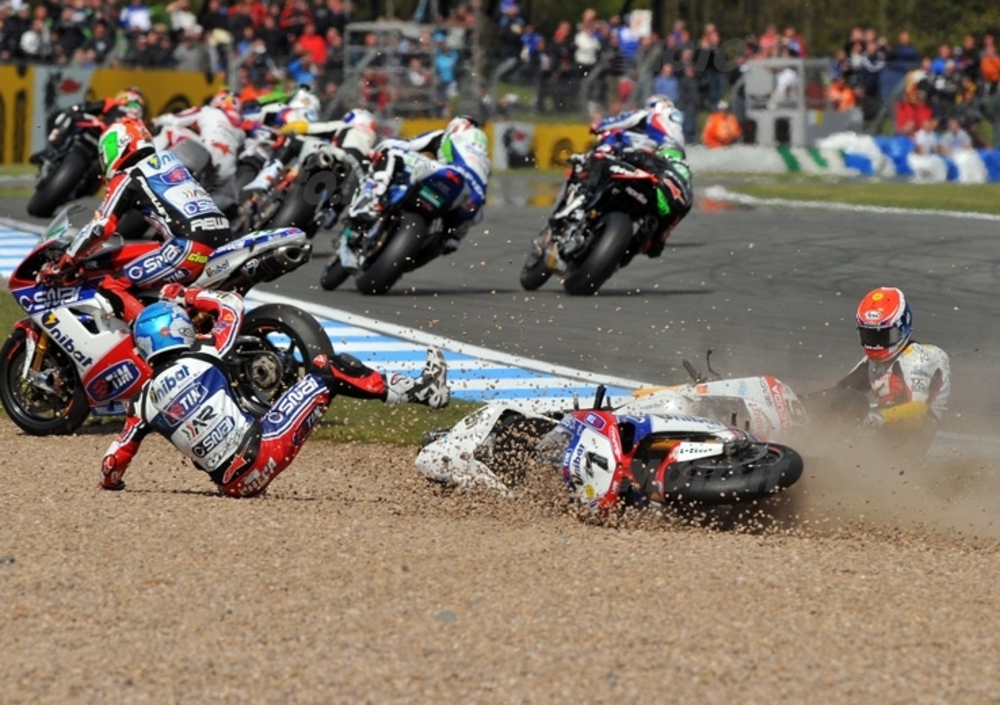 Sono gare come quelle di Donington che rendono spettacolare ed unico il motociclismo. Quaranta minuti (per manche) con il cuore in gola, perdendo il conto dei sorpassi, delle sportellate e delle sbandate. Sul circuito inglese i protagonisti assoluti sono stati gli stessi in entrambe le gare : Biaggi, Haslam, Melandri, Rea e Sykes (in ordine alfabetico per non far torto a nessuno). Tutti su moto a quattro cilindri. Quattro di loro sono partiti dalla prima fila ed uno dalla seconda (Rea). Ogni volta che uno di questi cinque sembrava sul punto di allungare sugli altri veniva regolarmente ripreso. Ogni volta che uno di loro sembrava tagliato fuori dalla lotta per la vittoria riusciva invece a recuperare e a rientrare in gioco. Si sono sorpassati o hanno tentato di sorpassarsi in ogni curva, all’esterno come all’interno, bastava che qualcuno lasciasse libero un varco per far sì che un altro ci si infilasse, con manovre da brivido.