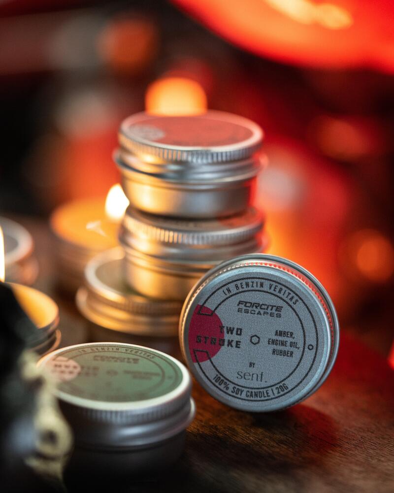 Dal sentore di carburante di Race Fuel, alla terrosità di Fresh Leather, agli accenni di sandalo all'interno di Mystic Forest: la collezione Motorcycling Aromas by Forcite è il risultato della collaborazione del team di progettazione di Forcite con Sent., produttore di candele personalizzate di Sydney, in Australia, per creare una gamma di aromi dedicati al mondo del motociclismo. Avviata come progetto giocoso, la produzione si è rivelata molto gradita dai motociclisti che hanno avuto occasione di provare gli aromi.