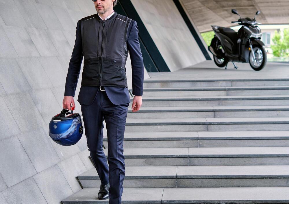 Questa la sua duttilità: è indossabile sotto o sopra alla giacca, anche con lo zaino e, tramite il sistema brevettato ARM LINK, il gilet è trasformabile in una giacca certificata moto CE in classe A.