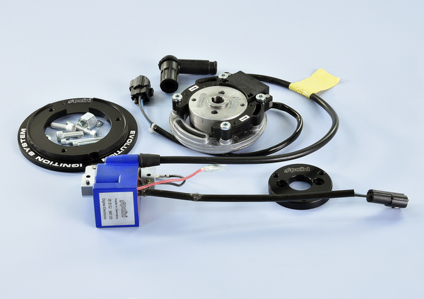 L’accensione è completa di supporto centralina, statore, rotore, bobina completa con CDI in cui è già inserita la mappa di accensione dell’anticipo elettronico. Il set up risulta molto semplice consentendo, la regolazione dell’anticipo meccanicamente.