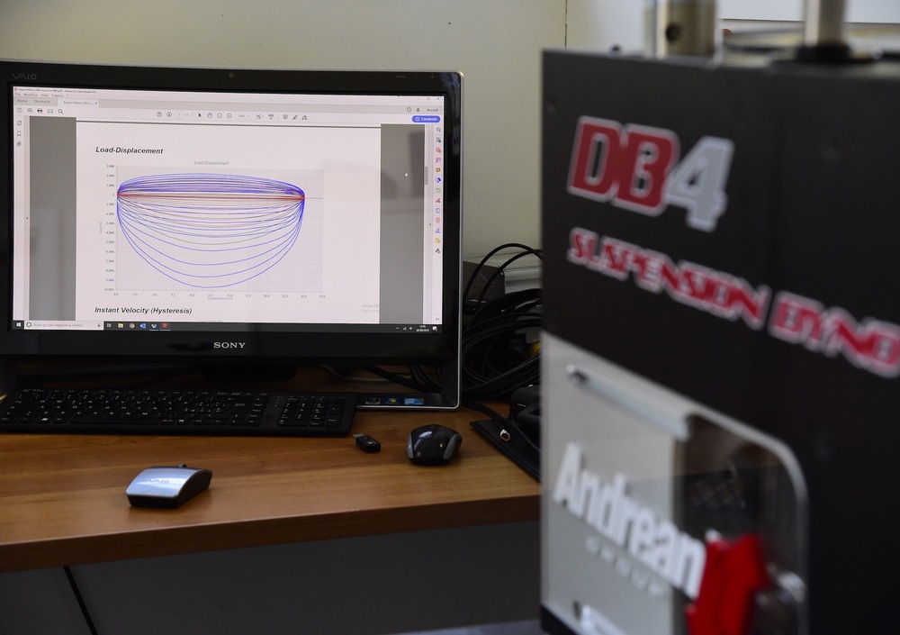 Non ci si ferma naturalmente qui, perché la famiglia di banchi più interessanti è la DB, ovvero quella dei banchi dinamometrici che misurano il comportamento di una sospensione sottoposta a sollecitazioni. In questo modo si ha la possibilità di misurare e valutare la dinamica di ogni possibile combinazione della sospensione, variandone le componenti e le tarature, per trovare soluzione a determinati problemi o dare risposta a qualche esigenza specifica. Durante la nostra visita abbiamo appunto avuto modo di vedere il responso di un banco DB4 su un’unità automobilistica, ma anche qualche grafico risultante da test su moto non ancora in produzione, a testimonianza di quanto sia importante e affidabile il lavoro dell’attrezzatura di Andreani Group.
