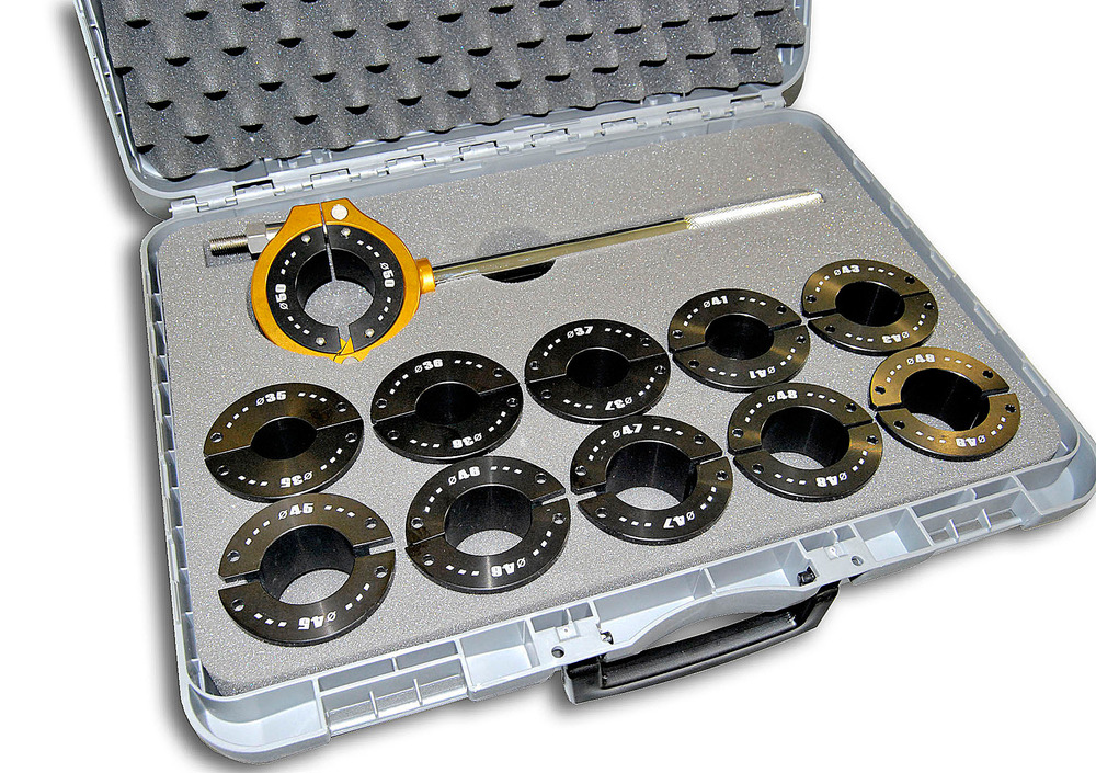 Si tratta di un indispensabile accessorio che permette di semplificare lo smontaggio degli steli forcelle in modo veloce e soprattutto sicuro, in quanto elimina il rischio di scalfirli o danneggiarli. Il kit è proposto nella pratica valigetta in plastica al cui interno si trovano la chiave e le varie riduzioni nei diametri 35, 36, 37, 41, 43, 45, 46, 47, 48, 49 e 50 millimetri.