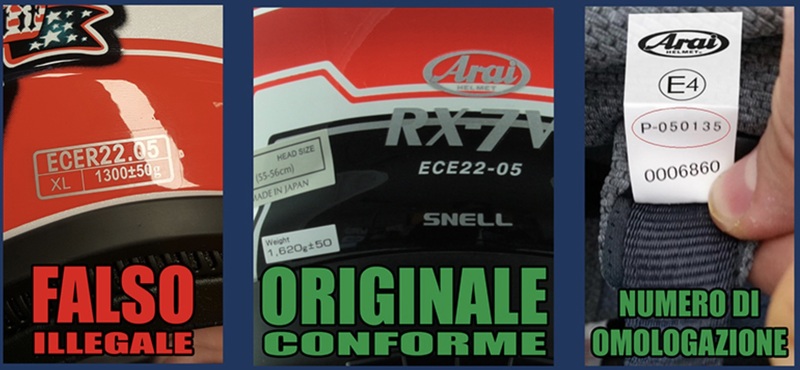 Non ci dovrebbe nemmeno essere bisogno di dirlo: tutti i caschi Arai regolarmente in vendita sul mercato europeo sono omologati ECE 22-05, eventuali altre omologazioni (DOT) o certificazioni (SNELL) sono in aggiunta su alcuni modelli top di gamma ma MAI in sostituzione. E' evidente che qualunque altra dicitura sia indice di un falso, potenzialmente non omologato e pericoloso.