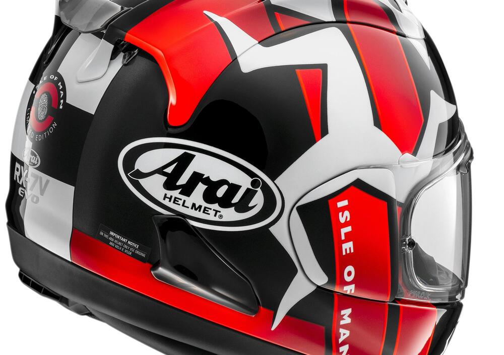Quest'anno la base è il nuovo casco RX-7V EVO omologato ECE R22-06, il top di gamma. Lo caratterizza la classica vernice nera, rossa e bianca che rende omaggio all'originale del 2007, e i componenti chiave sempre presenti sin dal primo modello speciale: il Triskelion, il logo TT doppio in grassetto sulla parte superiore, la bandiera a scacchi e il nome dell'isola di Man in lingua originale.