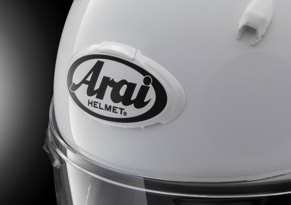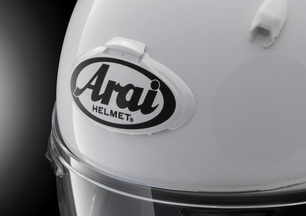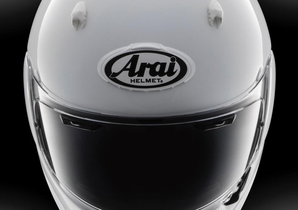 La presa con logo 3D frontale - sottilissima, solo 3,5 mm di profondità - alimenta due condotti da 10 mm, ed è quella più funzionale alle basse velocità quando si guida in posizione rialzata: già dai 50 km/h incanala un 40% in più d'aria, a 120 km/h (quando la posizione è fisiologicamente più accucciata) il 7%. Si apre e chiude facilmente con i guanti grazie a una levetta posizionata sulla parte superiore. Il logo Arai, naturalmente, è studiato per rompersi e volare via in caso di impatto.