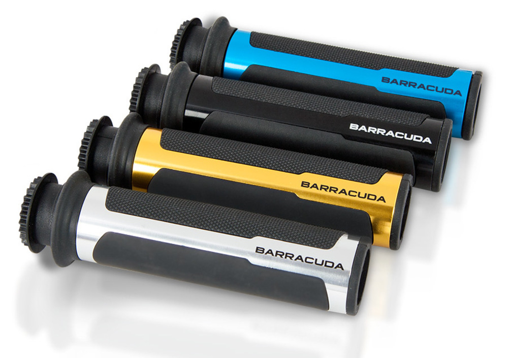 Disponibili nelle colorazioni argento, nero, argento oro e blu, le manopole Racing Grips sono universali e complete di tiragas, vengono vendute a coppia e sono disponibili sull'official e-store Barracuda.
