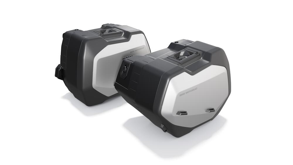 Il design delle valigie Vario e del top case Vario è stato completamente rivisto. Le finiture in alluminio anodizzato all'esterno delle valigie e all'esterno e sul coperchio del bauletto Vario non solo offrono una robusta affidabilità, ma insieme all'alloggiamento in plastica nera si integrano armoniosamente nel design della nuova BMW R 1300 GS.