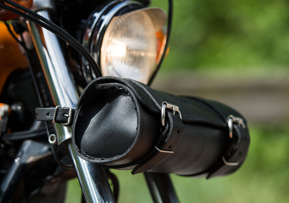 Forma a cilindro e spazio interno (3,5 litri) ideale per contenere piccoli oggetti. Anche in questo caso la chiusura è a doppia cinghia, con fibbia metallica e rivetti. Ulteriori due cinghe permettono il fissaggio del borsello al manubrio o alla parte alta della forcella.