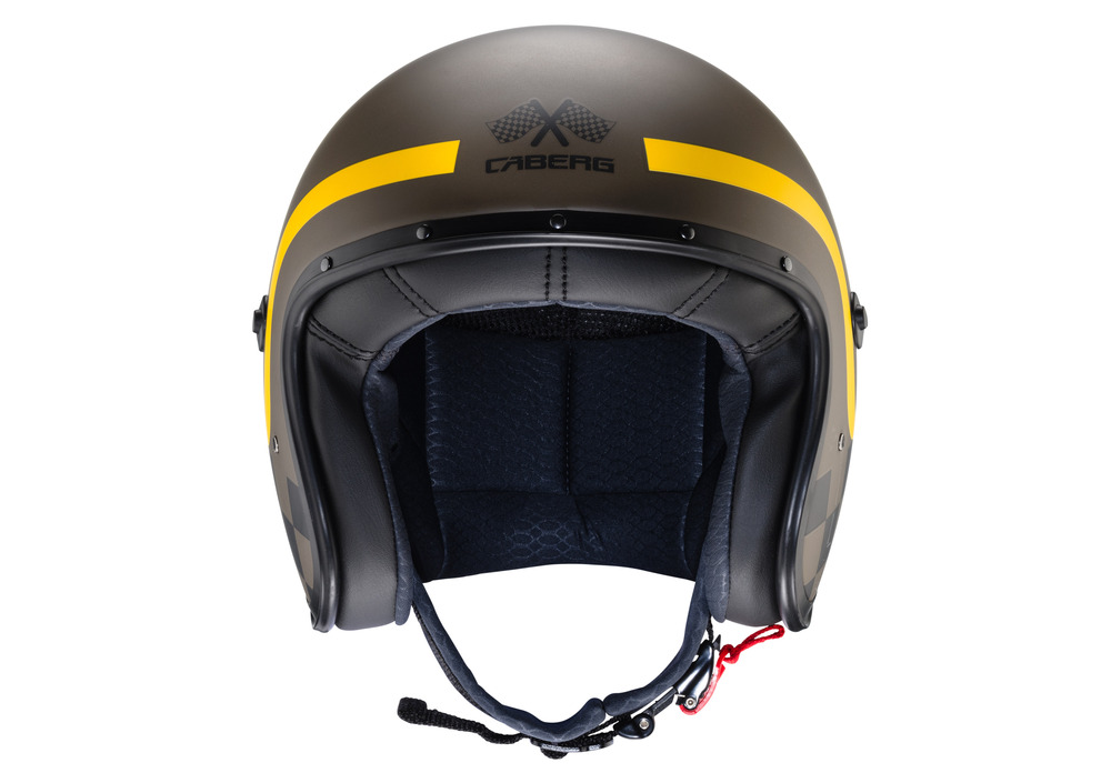 Le finiture tutte italiane, come i cinque rivetti affogati nel bordo calotta, il passaocchiali serigrafato, le prese d’aria in acciaio inserite nel paranuca, e gli inserti in pelle, dimostrano l’attenzione e la cura dei particolari.