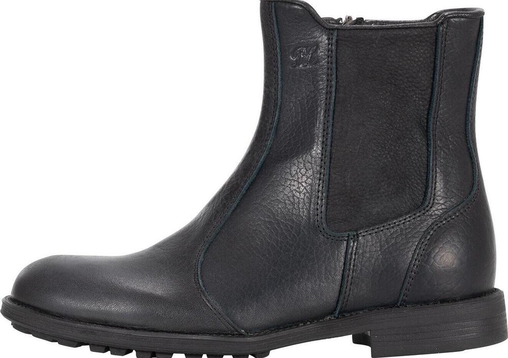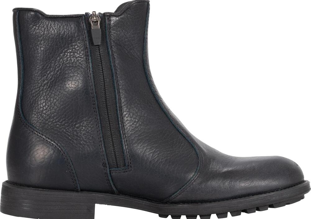 Pelle di vacchetta resistente e lucida, suola in gomma robusta, rinforzi alla caviglia e cerniera laterale.