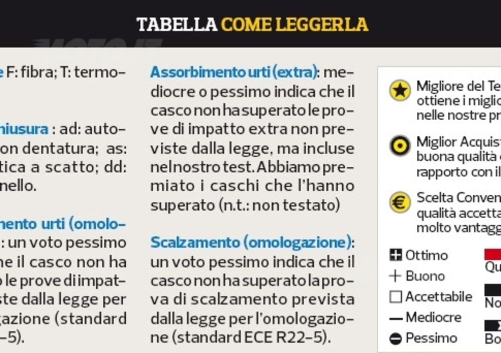 Materiale F: fibra; T: termoplastica. Tipo di chiusura ad: automatica con dentatura; as: automatica a scatto; dd: doppio anello. Assorbimento urti (omologazione): un voto pessimo indica che il casco non ha superato le prove di impatto previste dalla legge per l’omologazione (standard ECE R22-5). Assorbimento urti (extra): mediocre o pessimo indica che il casco non ha superato le prove di impatto extra non previste dalla legge, ma incluse nel nostro test. Abbiamo premiato i caschi che l’hanno superato (n.t.: non testato). Scalzamento (omologazione): un voto pessimo indica che il casco non ha superato la prova di scalzamento prevista dalla legge per l’omologazione (standard ECE R22-5).