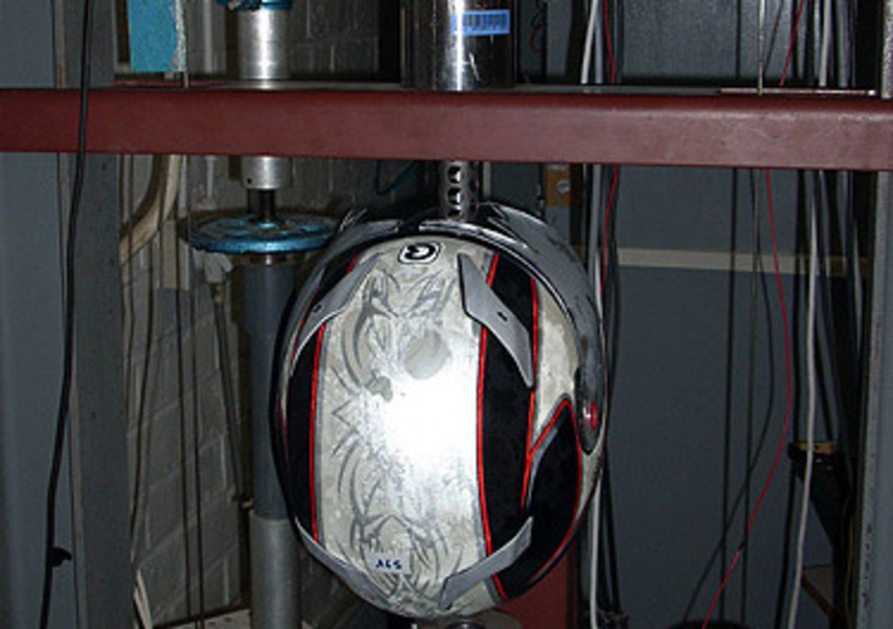 Senza entrare troppo nei particolari vi ricordiamo che l’omologazione vigente prevede che i caschi vengano sottoposti a numerose prove di laboratorio, tra le quali sono comprese quelle che prevedono che il casco venga fissato ad una falsa testa e lasciato cadere da un altezza di tre metri andando a battere contro un incudine. Il casco viene lasciato cadere sull’incudine in modo che vada a battere sulle cinque aree (sei se il casco è integrale) previste dall’omologazione : frontale, laterale destro, laterale sinistro, superiore, posteriore (oltre alla mentoniera se il casco è integrale). All’interno della falsa testa sul quale viene posizionato il casco, sono fissati tre accelerometri che trasmettono i dati al computer, il quale li elabora e mostra sul monitor e sul grafico conseguente.