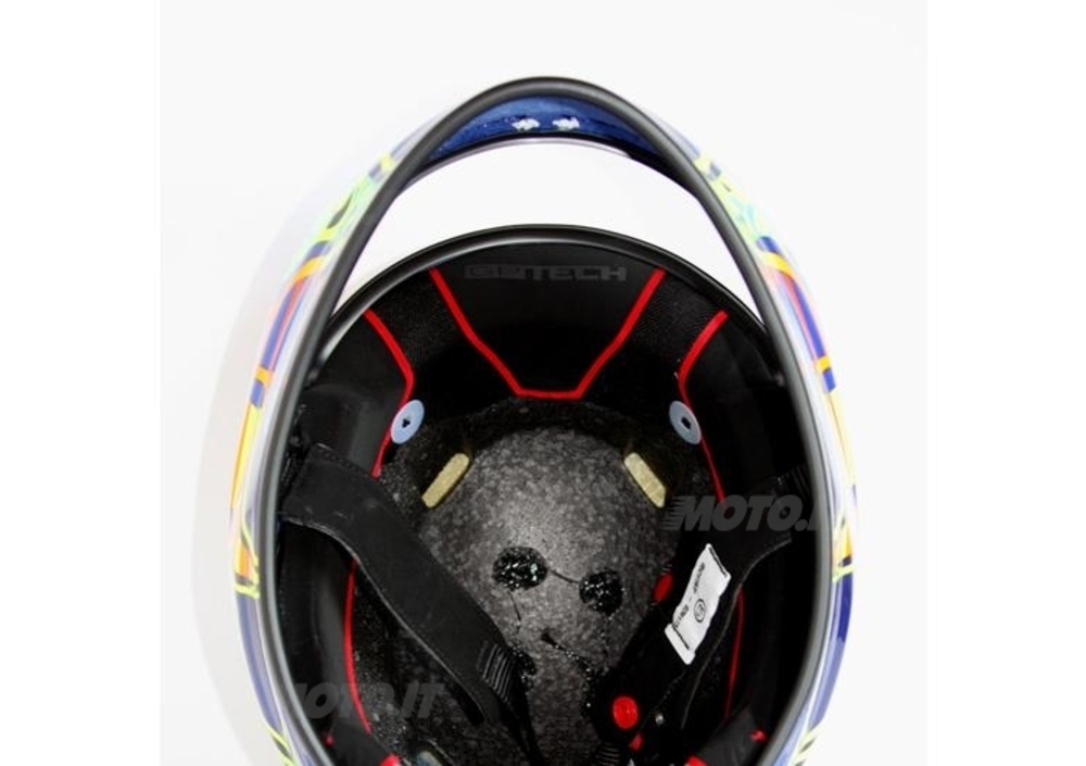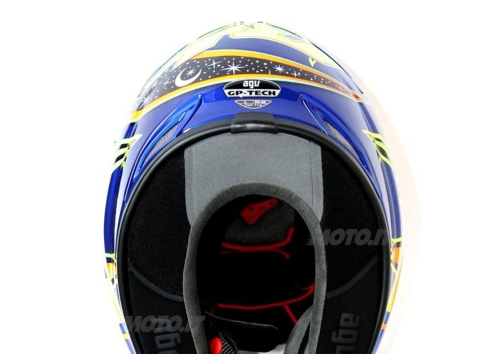 Particolare la forma della calotta esterna che presenta una pronunciata gobba posteriore che, oltre ad avere un effetto stabilizzatore alle alte velocità, protegge al meglio la nuca dell'utilizzatore in caso di impatto e questo aumenta notevolmente le capacità protettive del GP Tech. Da rilevare inoltre le due nervature laterali che confluiscono nella parte posteriore e che irrobustiscono il casco su entrambi i suoi lati. La calzata è tipicamente racing. Avvolge la testa dell'utilizzatore ed è abbastanza stretta sulle guance per aumentare la stabilità del casco anche alle alte velocità, quando magari si solleva la testa dal cupolino e si deve far fronte all'impatto dell'aria che tende a spostare all'indietro il nostro casco e la nostra testa. Non abbiamo certo esagerato con le staccate, ma con la moto sportiva abbiamo potuto apprezzare le doti di stabilità di questo casco dovute sia alla forma posteriormente allungata della calotta, che all'interno, che fissa saldamente il casco alla testa dell'utilizzatore. Certo dopo alcune ore la calzata racing ha iniziato a farsi sentire, anche se in un modo del tutto sopportabile. Le guanciole sono della giusta densità mentre la cuffia è ben imbottita e forata in corrispondenza dei fori degli estrattori presenti sulla calotta. L'interno dispone inoltre di un cuscinetto sul quale è cucito il logo AGV, che è in rilievo ed è posizionato proprio sulla nuca dell'utilizzatore. Questo cuscinetto oltre a spingere leggermente la testa di chi lo indossa verso la parte anteriore, serve proprio a contrastare la forza dell'aria che può spingere il casco all'indietro alle alte velocità. Evidentemente i suggerimenti di Valentino sono stati apprezzati e messi in pratica. Sufficiente e comodo lo spazio per le orecchie. Durante i nostri test le spugne non si sono mai ammorbidite e la densità è rimasta la stessa, garantendo quindi il mantenimento della taglia corretta. Anche il cinturino è ben imbottito e dispone naturalmente della chiusura a doppio anello di tipo racing, ed è formato da un robusto nastro tubolare nero, con il comodo bottone al quale ancorare il nastro stesso una volta serrato il nastro attorno ai due anelli.