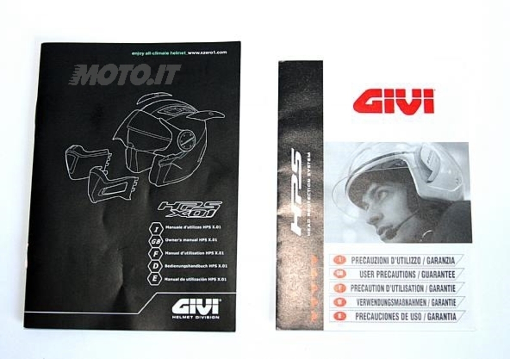 Il modello fornitoci dalla GIVI è il monocolore silver opaco. La dotazione che troviamo all'interno della scatola comprende il certificato di garanzia che tutela l'acquirente (due anni a partire dalla data di acquisto) da difetti di produzione e che comprende anche alcune indicazioni circa l'utilizzo del casco ed un libretto di istruzioni. Trattandosi di un prodotto che viene venduto a 319 Euro al pubblico, ci saremmo aspettati una garanzia di cinque anni, come avviene già per diverse marche. Entrambi gli opuscoli sono in cinque lingue. Le istruzioni sono chiare anche se succinte, corredate di disegni che aiutano a comprendere meglio le operazioni da effettuare per sostituire le mentoniere, posizionare o rimuovere le coperture per le prese d'aria superiori, alzare ed abbassare il visierino interno parasole, smontare e montare la visiera esterna, aprire e chiudere la presa d'aria posta sulla mentoniera invernale, rimuovere i guanciali interni, utilizzare lo sgancio micrometrico, rimuovere le imbottiture interne di comfort.