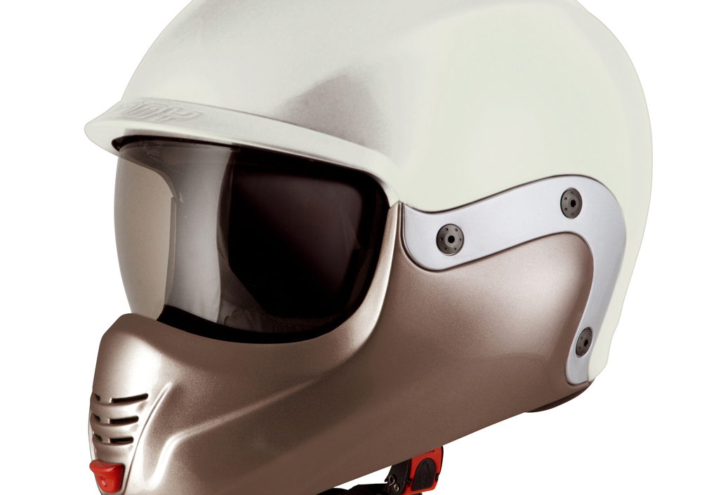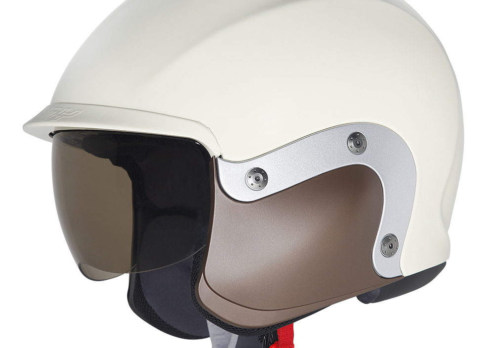 E' dotato di frontino parasole integrato nella calotta, visiera interna fumè chiara e la caratteristica di poter essere trasformato in casco integrale a tutti gli effetti.