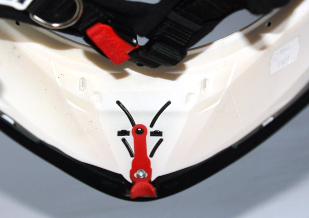 Il meccanismo della visiera è molto semplice e funzionale. Per rimuovere la visiera basta aprirla e spingere verso l’interno la parte interna del bottone laterale attorno al quale fa perno la visiera. In questo modo la visiera si sblocca e la potremo rimuovere per pulirla o sostituirla. Per rimontarla basta ancora una volta agire in senso inverso e spinta verso l’interno la parte centrale del perno inserire la visiera nella sua sede. Tolta la visiera se vogliamo possiamo rimuovere anche la placchetta nera che cela nella parte interna le molle del movimento visiera. Basta spingere verso l’alto la leva che troviamo nella parte inferiore della placchetta e contemporaneamente far forza leggermente sotto la placca con un cacciavite o anche solo con una monetina. Per fissarla nuovamente alla calotta, inseriremo le due linguette superiori nelle apposite cavità e premeremo poi la parte bassa della piastra per inserire la parte mobile (quella che abbiamo spinto verso l’alto per rimuovere il meccanismo) nella sua sede. Infine notiamo che la visiera dell’Ego dispone di un dentino nella parte interna centrale che serve come un ulteriore fissaggio della visiera alla calotta una volta chiusa e che evita che alle alte velocità, magari girando la testa lateralmente, la visiera si possa aprire. Al contrario se non agganciamo la visiera alla calotta con questo piccolo dente, la nostra visiera resterà leggermente aperta aumentando la quantità di aria all’interno del nostro casco (anche se una volta aperta la presa d’aria superiore l’aria all’interno dell’Ego sarà più che sufficiente).