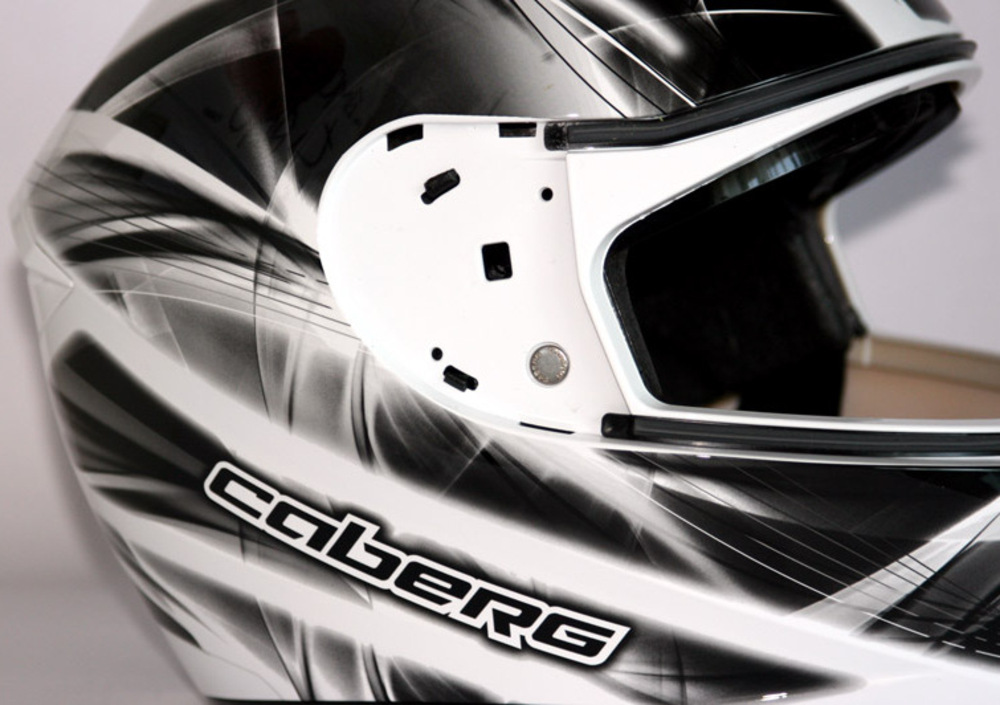 Il suo polistirolo presenta due fori di notevoli dimensioni sulla parte frontale (insieme liberano più di 60 cm2) e la calotta esterna, in corrispondenza dei due fori, dispone di una robusta griglia in acciaio inossidabile e di una saracinesca in plastica che serve per regolare il flusso d’aria che proprio dai due fori può entrare nel casco. Se a questa presa d’aria superiore aggiungiamo quella posizionata sulla mentoniera (a sua volta regolabile tramite un bottone rosso posizionato proprio sotto la mentoniera) e i due estrattori presenti nella parte posteriore della calotta, ci accorgiamo subito che il flusso d’aria che può circolare all’interno della calotta non ha riscontro con nessun altro casco integrale attualmente disponibile sul mercato. Caberg ha testato questo casco nella galleria del vento della Newton (laboratorio italiano di prova indipendente, accreditato ISO17025 per prove su caschi per motociclisti) ed ha determinato che con le prese d’aria completamente aperte, ad una velocità costante di 90 km/h la temperatura interna del casco diminuisce di ben quattro gradi in pochi secondi.