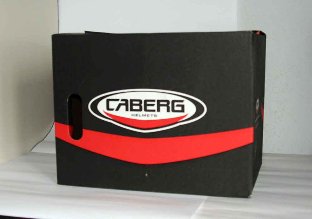 La scatola che lo contiene è robusta e funzionale, mentre il sacchetto porta casco è nero, con due loghi diversi, stampati sui due lati dello stesso. Uno sguardo all’'etichetta omologativa per apprendere che Caberg omologa il Tourmax in Italia e che questo casco dispone della doppia omologazione, jet ed integrale, entrambi in conformità con la vigente normativa ECE 22-05. Questa doppia omologazione sta a significare che il Tourmax si può utilizzare sia come integrale, con la mentoniera abbassata, che come jet, con la mentoniera completamente sollevata.