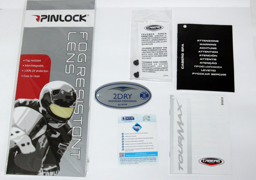 Nella scatola assieme al casco troviamo un visierino pinlock e due libretti di istruzioni. Il primo con la copertina nera, contiene preziose informazioni circa l'utilizzo del casco in generale, mentre il secondo, con la copertina bianca, è invece il libretto di istruzioni specifico per questo casco e spiega molto bene, con l'ausilio di foto chiare ed esaustive, come sostituire sia la visiera esterna che quella interna, come utilizzare il sistema di apertura/chiusura della mentoniera, come rimuovere le imbottiture interne di comfort ed infine come aprire e chiudere le prese d'aria, inferiore e superiore. Il tutto in cinque lingue. I libretti ci informano inoltre del fatto che il Tourmax è predisposto per l'utilizzo del sistema di comunicazione Caberg denominato Just Speak Easy, un sistema opzionale wireless che permette di comunicare con il proprio telefono cellulare, con il passeggero, con il navigatore satellitare, con un riproduttore MP3 o con una radio. Just Speak Easy utilizza il profilo Bluetooth A2DP che permette l'ascolto in alta qualità stereo.