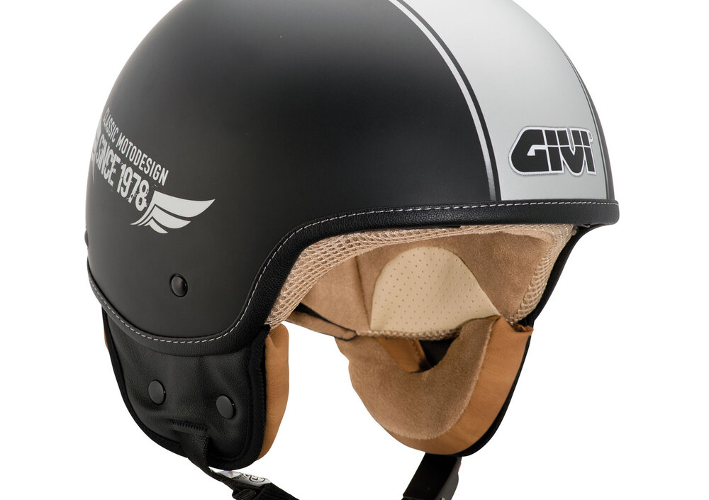 Sfoggia una linea minimal ma ricercata nelle forme e nei dettagli; è leggero (siamo sotto il chilogrammo) e completato da un interno color cammello, microforato nella zona della fronte, completamente sfoderabile. Azzeccata anche la scelta dei colori, che comprende 5 varianti: bianco lucido, nero opaco e verde militare opaco sono le tre monotinte, impreziosite lateralmente da una stella a 5 punte. Bicolor le altre due proposte: una lucida l’altra opaca, con black and white che giocano a scambiarsi le parti + il logo laterale “Classic motorstyle since 1978” (la storia di GIVI parte da qui).