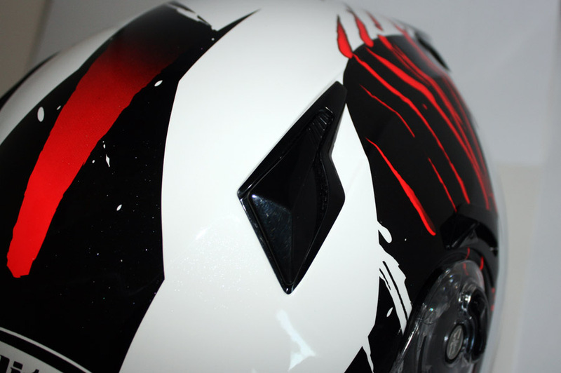 Prima di iniziare a smontarlo, diamo un occhiata al casco ancora completo. La calotta esterna è piccola e compatta per offrire poca resistenza all’aria. La parte frontale è liscia e con le prese d’aria incassate nella calotta, mentre la parte posteriore è caratterizzata dallo spoiler stabilizzatore, che funge anche da estrattore d’aria. La grafica non ci fa impazzire, ma non è nemmeno brutta. La verniciatura non presenta difetti, così come le decals. Il meccanismo visiera non presenta sporgenze, se non quella del bottone nero a forma di fagiolo, che come vedremo ha un doppio compito, e la levetta triangolare sempre nera, che aziona la visiera parasole interna.