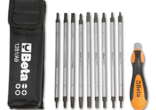 Astuccio con assortimento di 9 giravite bivalenti + l’impugnatura di manovra.