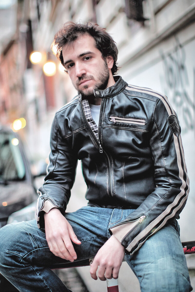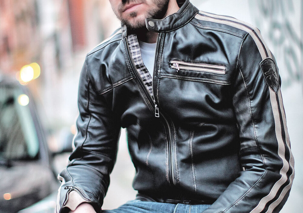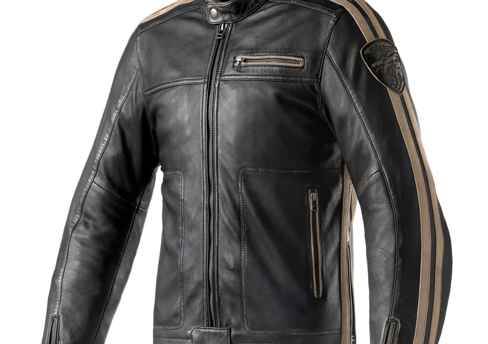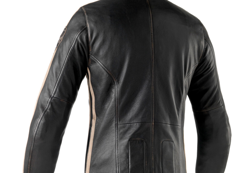 La pelle è nera, ma con inserti chiari che corrono lungo le maniche e che contrassegnano le zip delle tasche.