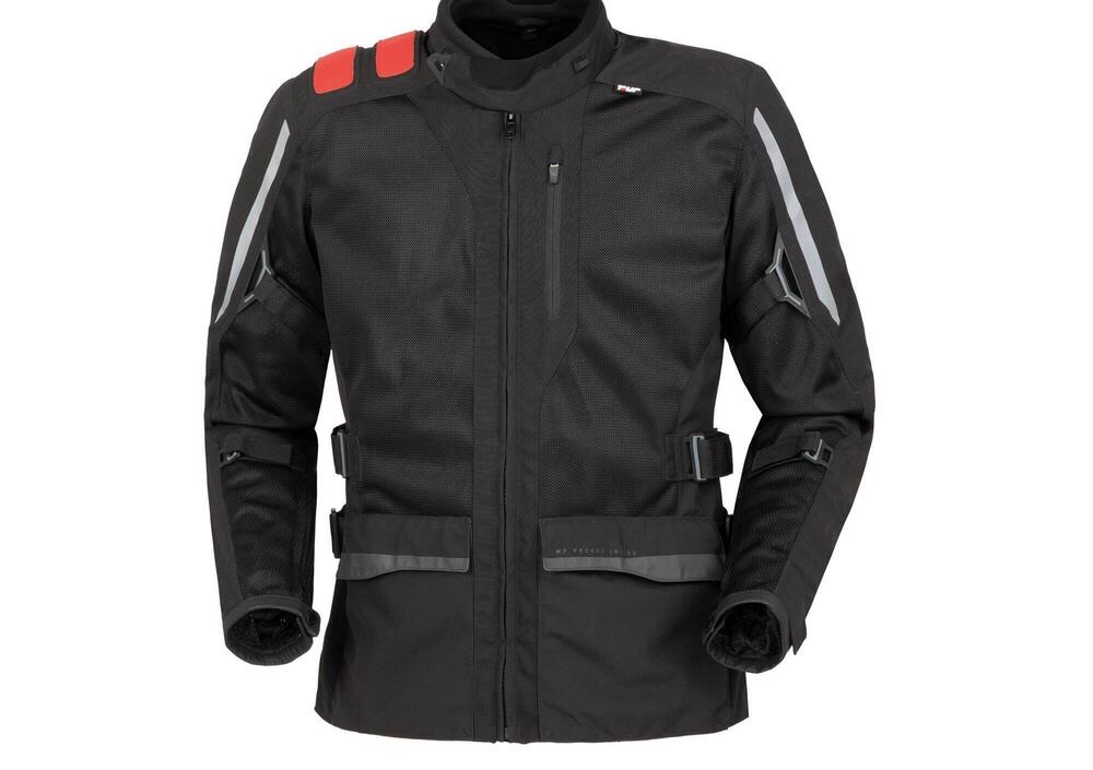 Il busto è composto da tre strati: il tessuto tecnico esterno (primo strato) è accoppiato con un membrana impermeabile e traspirante (secondo strato), che è a sua volta unita a un particolare pile (terzo strato) dalla texture esagonale, capace di incanalare e trattenere il calore, e quindi di offrire un certo grado di termicità. Il che dà il vantaggio di rendere la giacca più versatile e adatta anche alle condizioni meteo non prettamente estive. Le maniche sono anch’esse impermeabili e traspiranti, ma senza la fodera in pile per favorire il movimento alla guida.